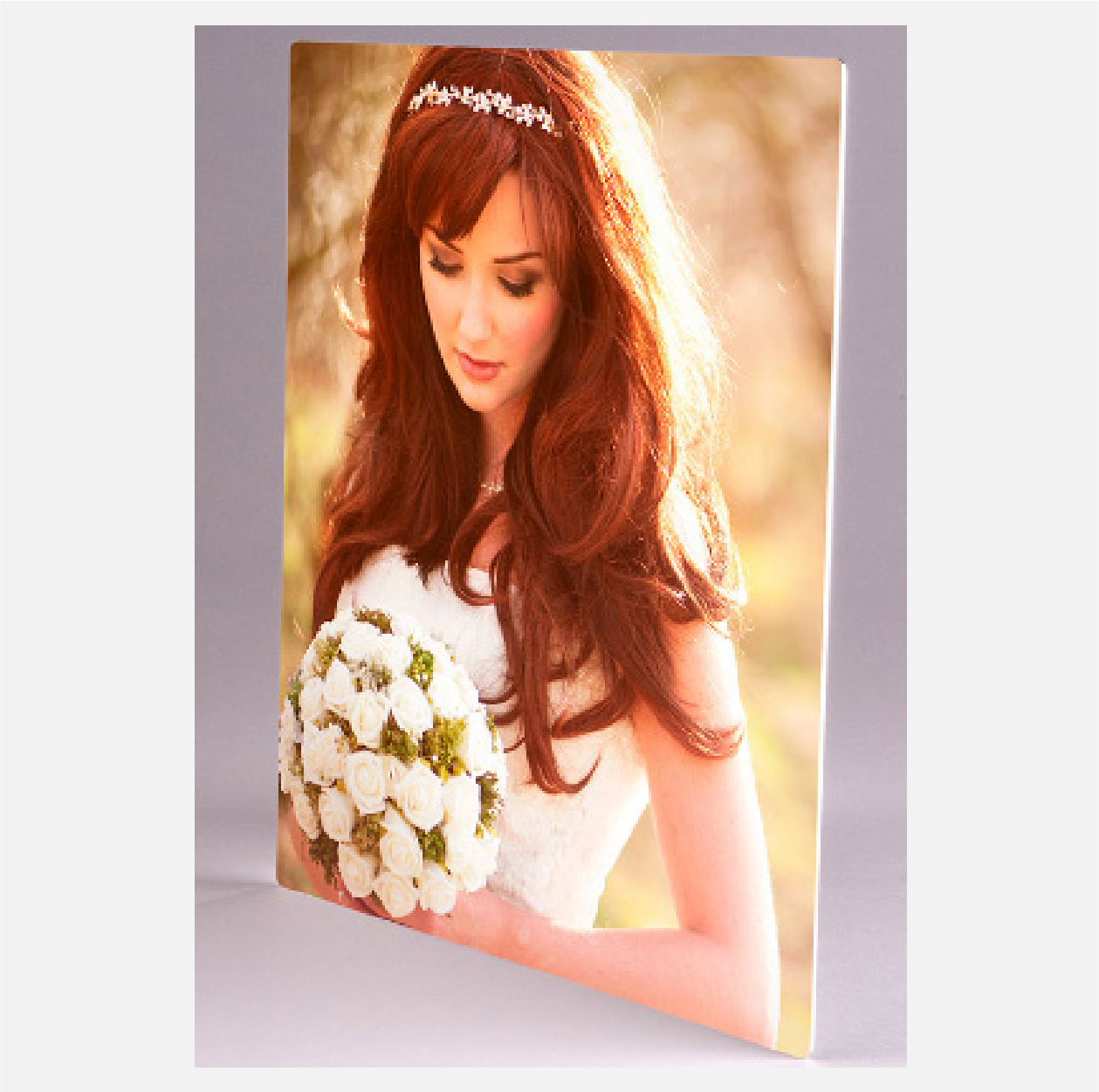 Choose from a white or clear colored coating and glossy or matte finishes. A clear colored coating means the aluminum sheet replaces the white tones in an image, giving the image a metallic sheen. The matte finish is a low gloss that has less reflection when displayed. All colors and finishes produce stunning, crisp images.