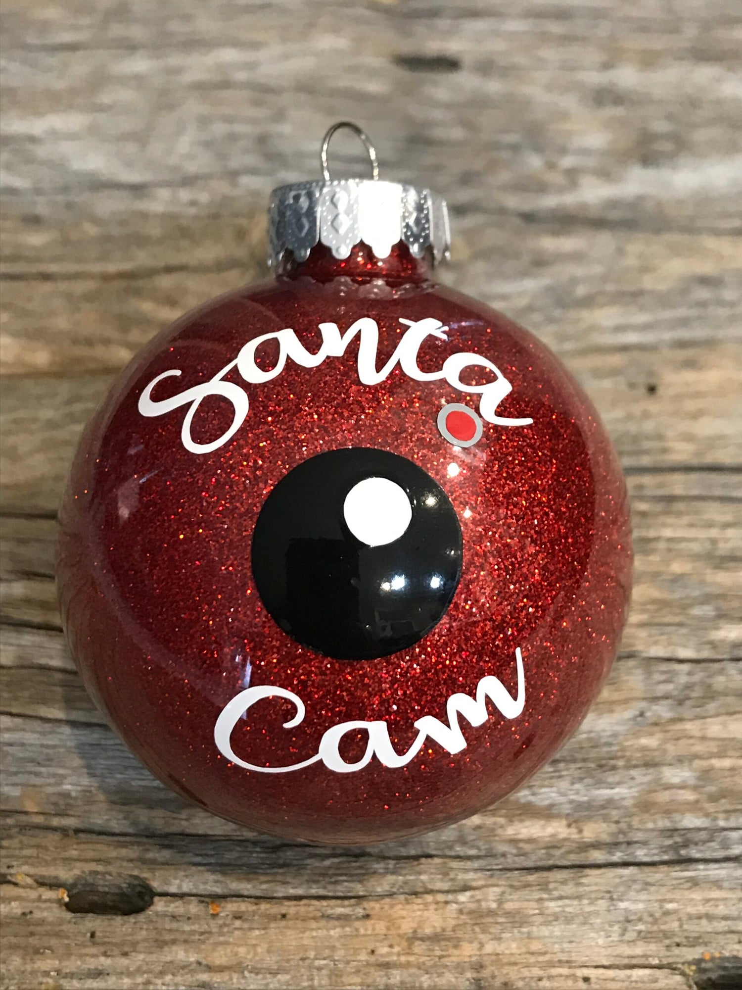 Glitter ornament with vinyl decal(s) that represents a camera. Comes with a cute saying to let kids know “Santa is watching” so be nice! Available in Black or Red.
