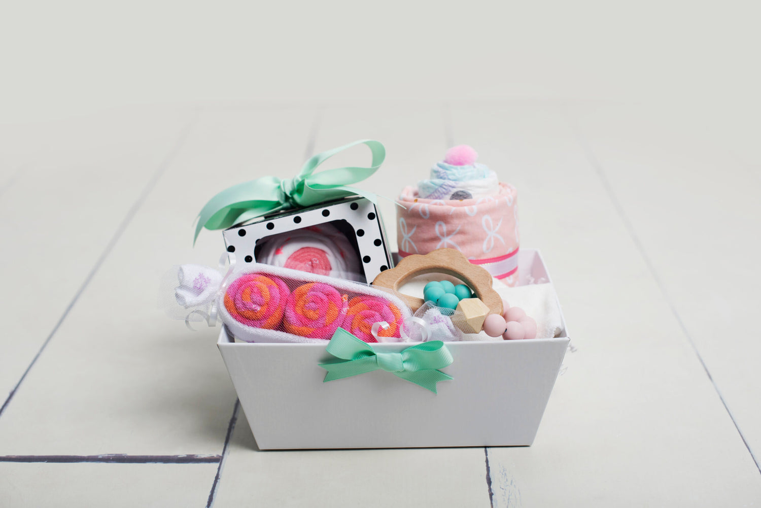 This adorable gift basket is created from items for baby. Cupcakes made from onesies, wash cloths, diapers and burp cloths are beautifully complimented by “peas in a pod” wash cloths and a wooden teether. The sturdy basket can be used afterwards to store diapers, changes of clothes, burp cloths, etc.
